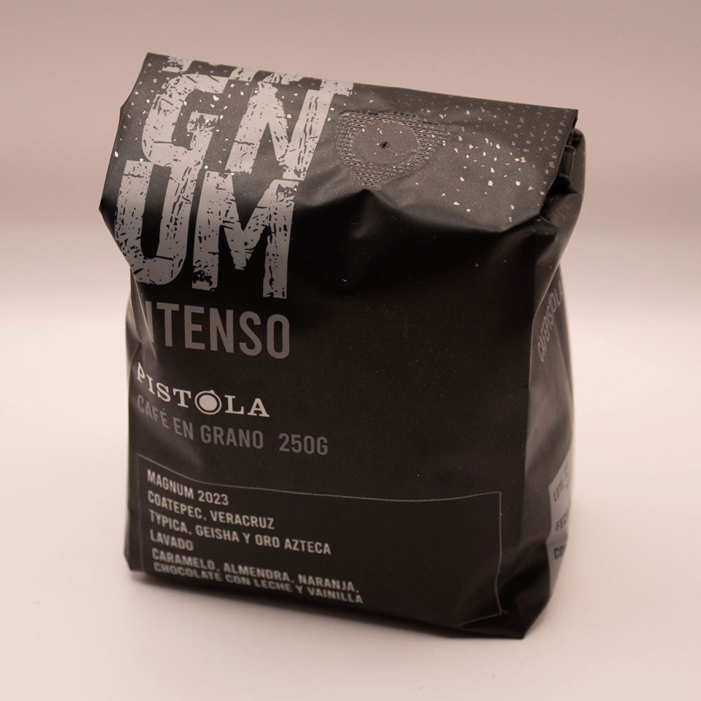 Nuestra última versión de Magnum es de grano lavado typica, geisha y oro azteca de Coatepec, Veracruz. Sus notas son de caramelo, almendra, naranja, chocolate con leche y vainilla.